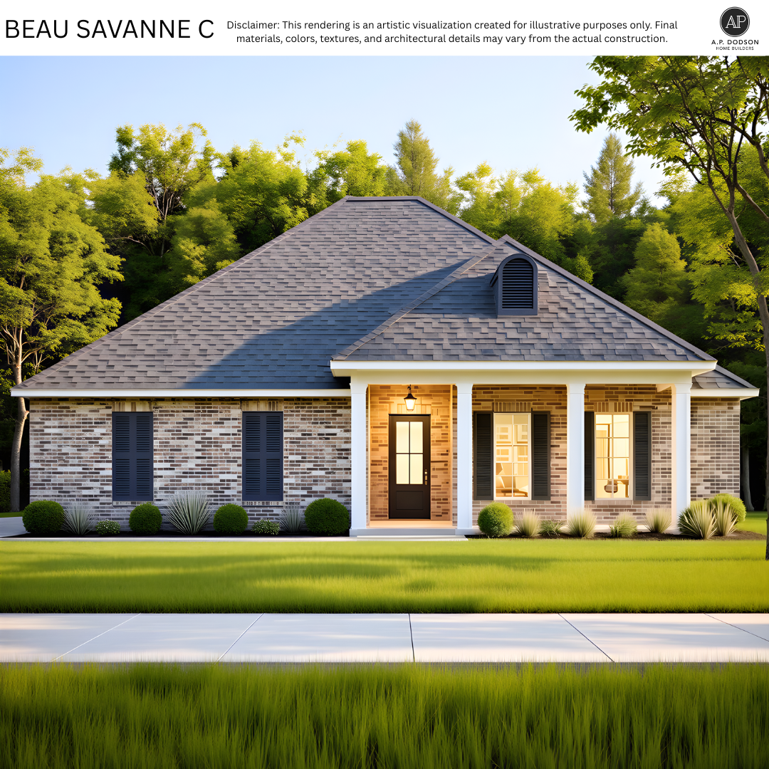 The Beau Savanne C by A.P. Dodson is a single-story home delivering 4 bedrooms and 3 bathrooms across 2,219 sq. ft. The open layout features a large kitchen with 10' ceilings and pantry that seamlessly connects to the primary living and dining areas. The generous Owner's Suite includes a luxury bath with double vanities and a large walk-in closet. Bedrooms 2 is located on one side with a full bath in the hall. Bedrooms 3 & 4 have a jack and jill bath on the other side. This home also includes a 2-car garage with storage area, dedicated utility room, and large rear porch perfect for outdoor living.