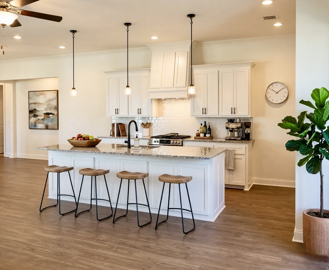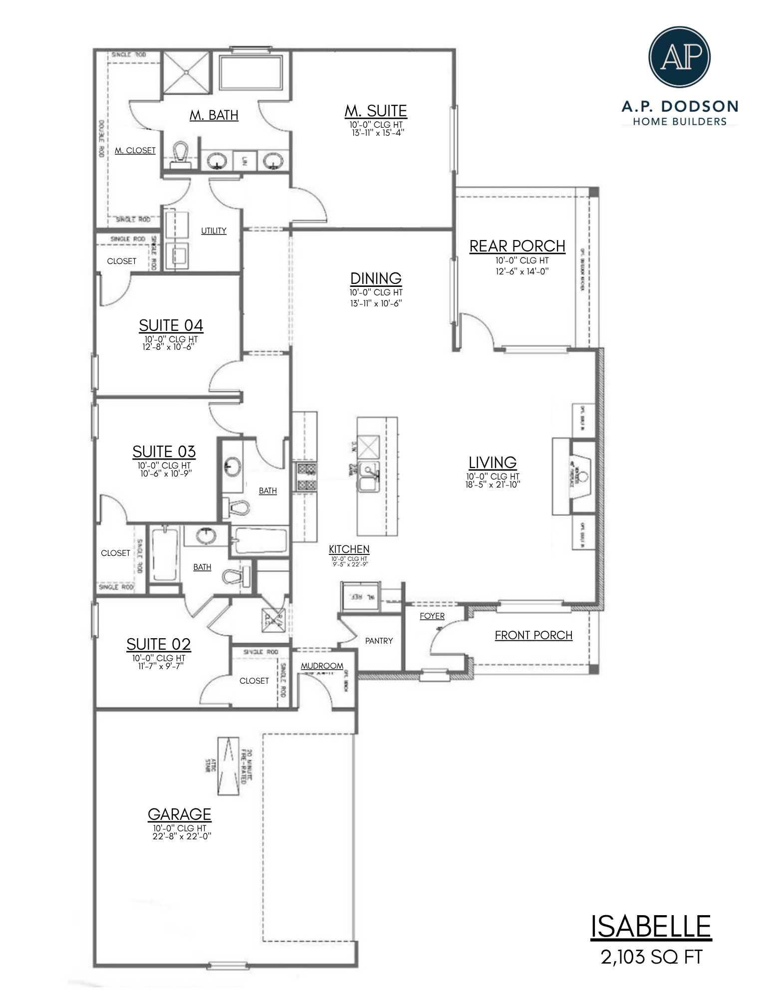 The Isabelle by A.P. Dodson is a single-story home delivering 4 bedrooms and 3 bathrooms across 2,103 sq. ft. The open layout features a grand kitchen with 10′ ceilings and a large pantry that seamlessly connects to the primary living and dining areas. The generous Owner’s Suite includes a luxury bath with double vanities and a large walk-in closet. Bedrooms 2 has a private bath and bedrooms 3 & 4 share a bath in the hall. This home also includes a 2- car garage, dedicated utility room, and a large rear porch perfect for outdoor entertainment.