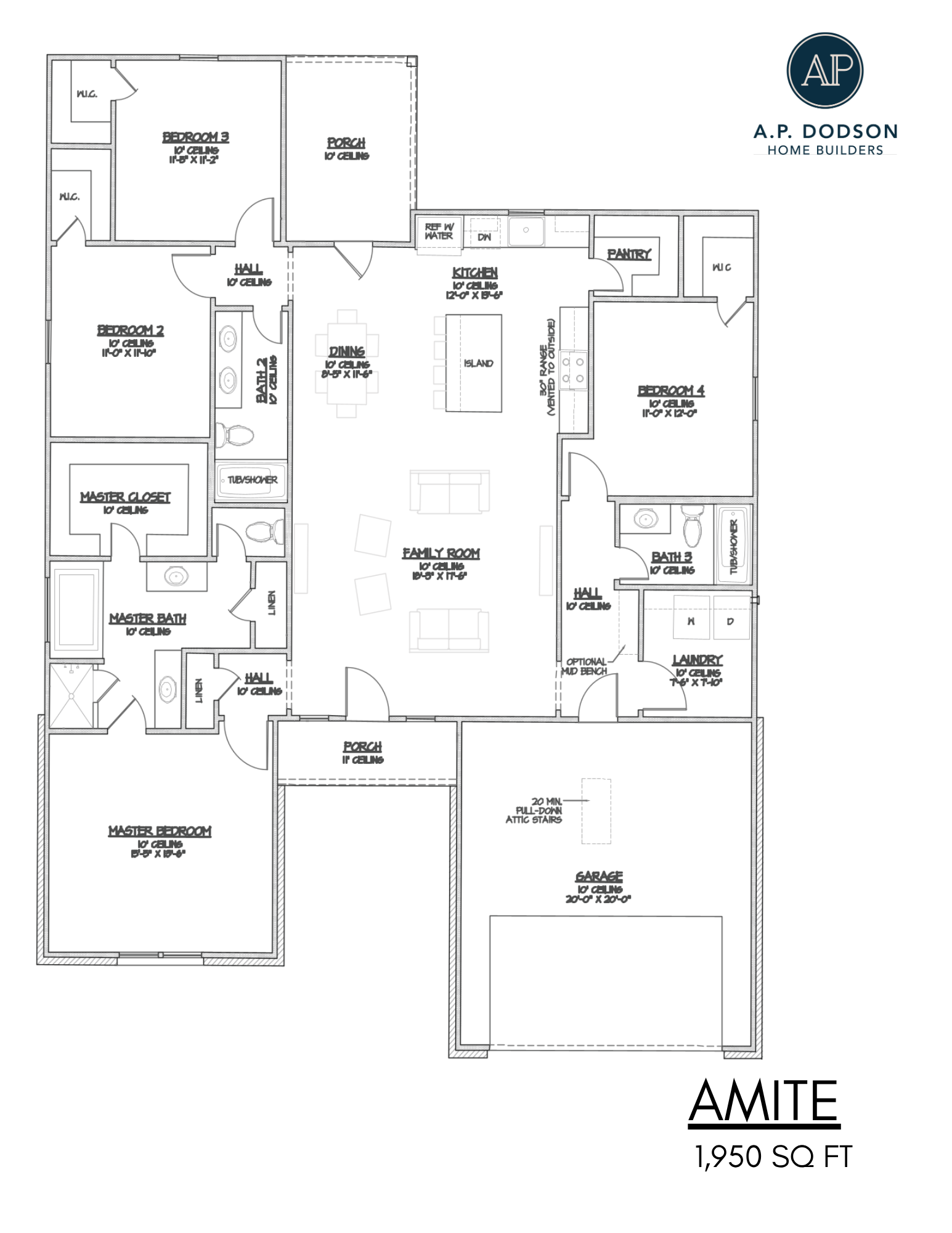 The Amite by A.P. Dodson is a single-story home delivering 4 bedrooms and 3 bathrooms across 1,950 sq. ft. The open layout features a grand kitchen with 10′ ceilings and a large pantry that seamlessly connects to the primary living and dining areas. The generous Owner’s Suite includes a luxury bath with double vanities and a massive walk-in closet. Bedrooms 2 & 3 share a full bath and Bedroom 4 and bath 3 are located on the other side of the home. This home also includes a 2-car garage, dedicated utility room, and large rear porch perfect for outdoor entertainment