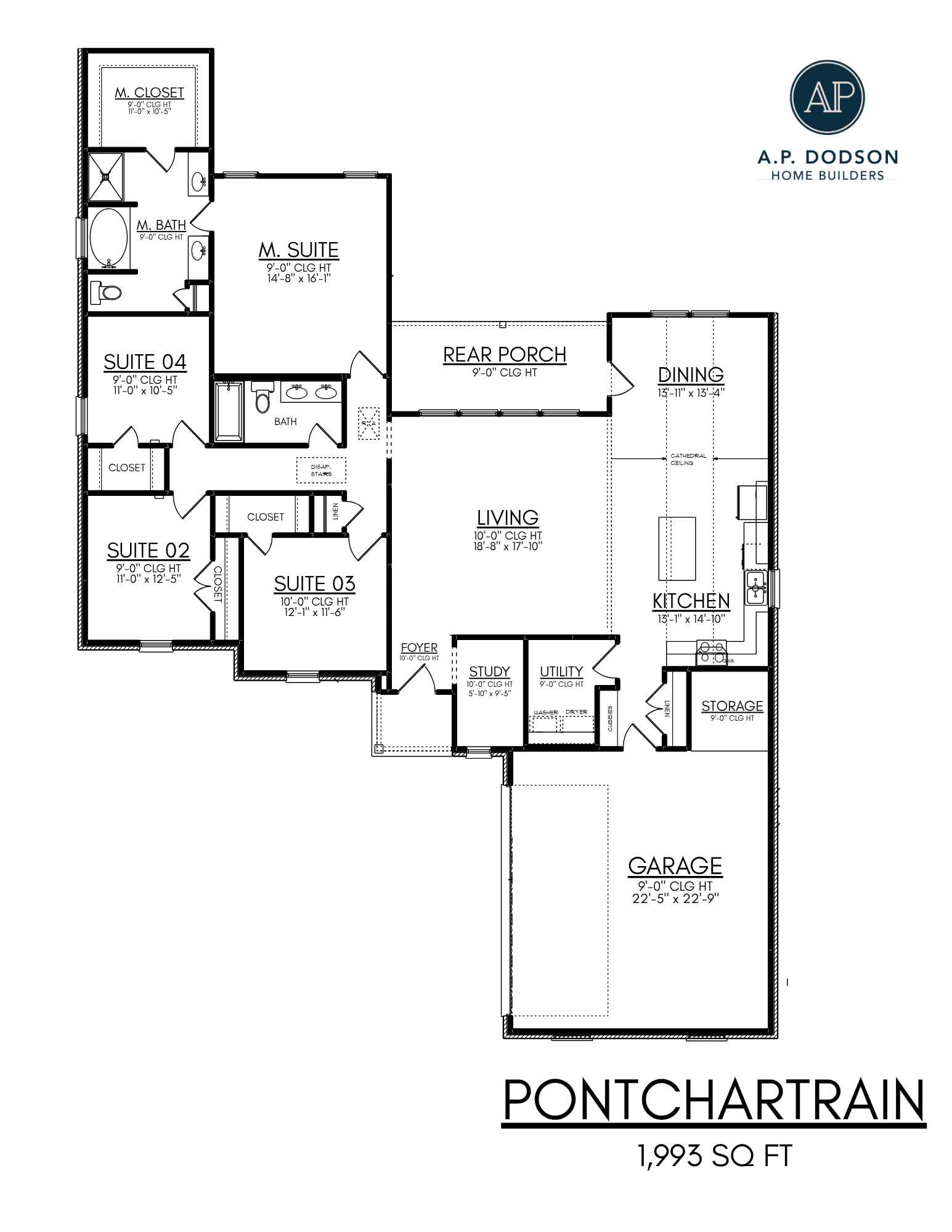 The Pontchartrain by A.P. Dodson is a single-story home delivering 4 bedrooms, study, and 2 bathrooms across 1,993 sq. ft. The open layout features a large kitchen with beautiful cathedral ceilings and seamlessly connects to the primary living and dining areas. The generous Owner’s Suite includes a luxury bath with double vanities and a massive walk-in closet. The remaining three bedrooms share a full bath. This home also includes a 2- car garage, dedicated utility room, and large rear porch perfect for outdoor living.