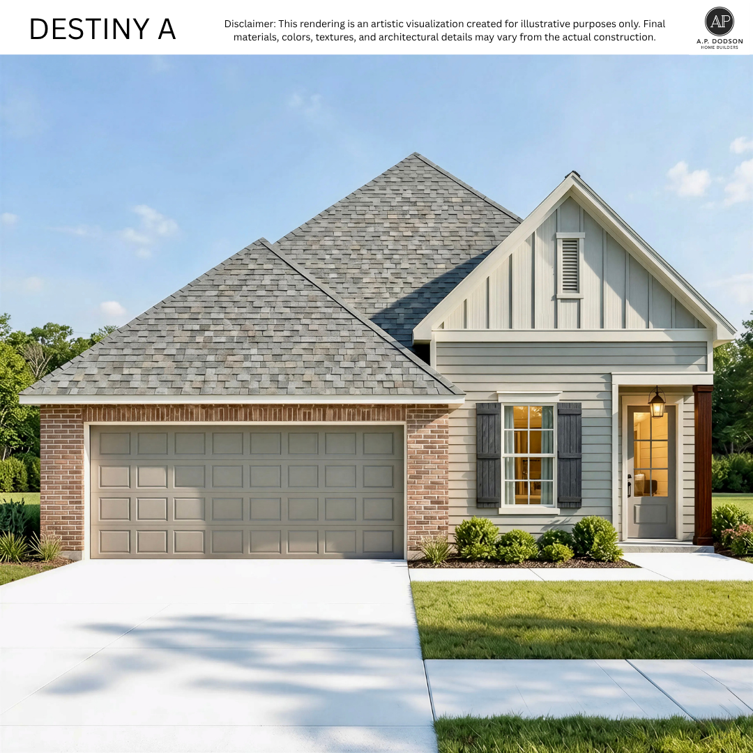 The Destiny A by A.P. Dodson is a single-story home delivering 3 bedrooms and 2 full bathrooms across 1,748 sq. ft. The open layout features 10′ ceilings and a large kitchen island and seamlessly connects to the primary living and dining areas. The generous Owner’s Suite includes a luxury bath with double vanities and a large walk-in closet. The remaining two bedrooms share an additional full bath located in the hall to offer superior flexibility. This home also includes a rear porch featuring tongue and groove wood ceilings, 2-car garage with storage area, and dedicated utility room.